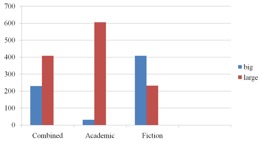 Frequencies of the words “big” and “large” in 5.7 million words of mixed text, in 2.7 million words of academic prose, and in 3 million words of fiction. The y axis is the normalized frequencies per million words. Picture source: me. Data source: Biber, Conrad, and Reppen (1998).